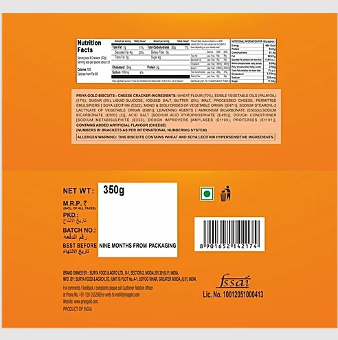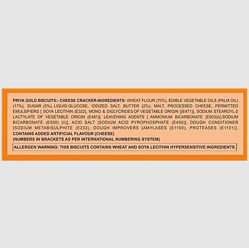 Priyagold Cheez Cracker Biscuit (Lite khavoo Lite Rahoo.) Perfectly crisp yet soft, our crackling cheese biscuits is oh so thin, light and crisp and are much more than just a delicious snack. The tasty, melt-in-the-mouth texture of this striking biscuit incorporates a delicious cheese flavour and are perfect for munching on their own or in combination with a spread or topping.