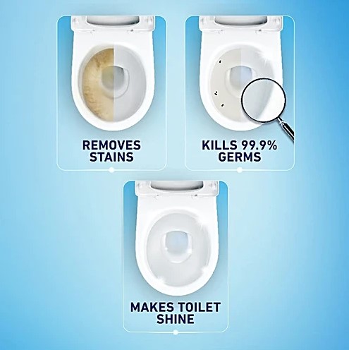 - Unique colour-changing formula shifts from green to blue, ensuring effective germ removal for a hygienic toilet