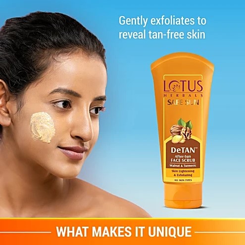 Lotus Herbals Safe Sun DeTan After-Sun Face Scrub is specially formulated to gently exfoliate dead skin cells and remove sun-induced tan. Enriched with natural ingredients like walnut shell powder, turmeric, and licorice extracts, it deeply cleanses the pores, brightens the complexion, and helps restore your skin’s natural radiance. Suitable for all skin types, this scrub is a must-have for summer skincare to reverse the effects of sun damage.