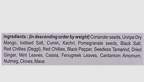Coriander Seeds, Unripe Dry Mango, Iodised Salt, Cumin, Red Chillies, Kachri, Black Salt, Pomegranate Seeds, Black Pepper, Seedless Tamarind, Dried Ginger, Mint, Leaves, Cassia, Fenugreek Leaves, Cardamom Amomum, Nutmeg, Cloves, Mace, Black Salt, Red Chilli Deggi