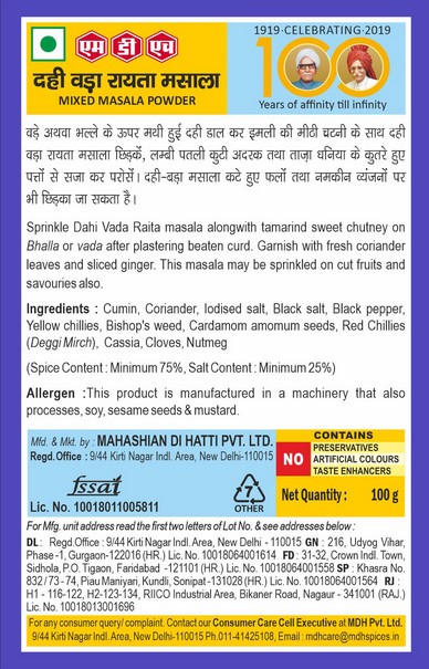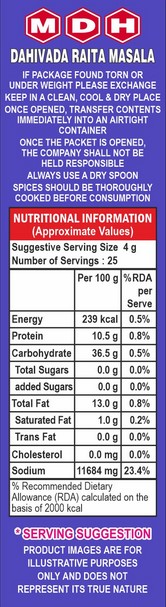 MDH Raita Masala is a flavorful and authentic Indian spice mix. FSSAI No: 10012022000345