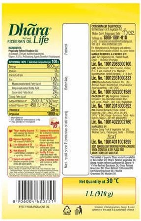 Dhara Life Refined Rice Bran Oil comes with natural oryzanol which has antioxidant properties and reduces high blood cholesterol promoting heart-healthy cooking. Dhara Life Refined Rice Bran oil is rich in antioxidants and essential fatty acids. Its light and neutral taste enhances the flavour of your food without overpowering it. Dhara Life Refined Rice Bran Oil is the first choice for health-conscious families. Order Dhara Life Refined Rice Bran Oil online now and enjoy healthy, delicious meals.